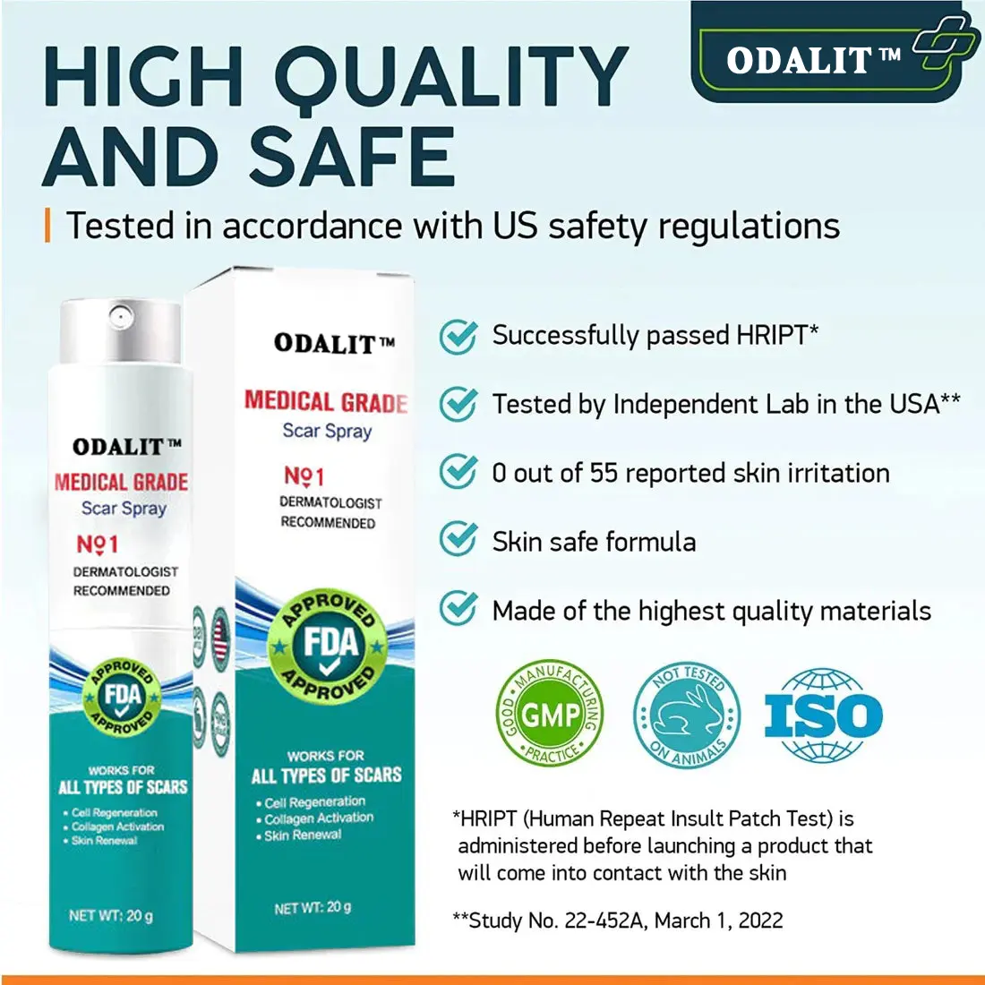 ODALIT™ Scar Spray- Made with allantoin and advanced scar Spray, our formula helps promote skin health, firmness, and elasticity to reduce the appearance of most types of scars, including surgical scars, burn scars, hypertrophic scars, and keloids. The silicone-based scar spray forms a breathable layer to increase the skin hydration, protect the scar tissue, normalize the collagen synthesis and balance the skin growth procedure,which can make your skin look smooth and even!
