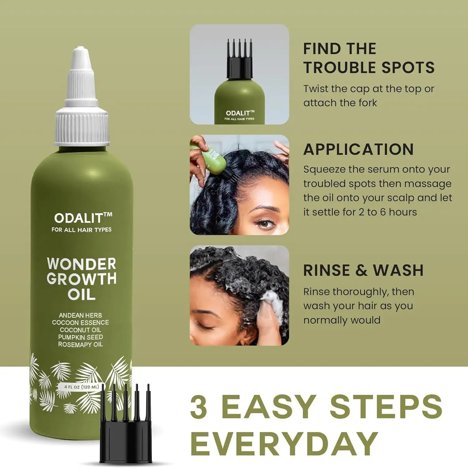 Meet ODALIT™ Wonder Growth Oil—a daily/weekly hair and scalp oil designed to help hair look healthier, stronger, smoother, and more voluminous over time—with no complex steps required.